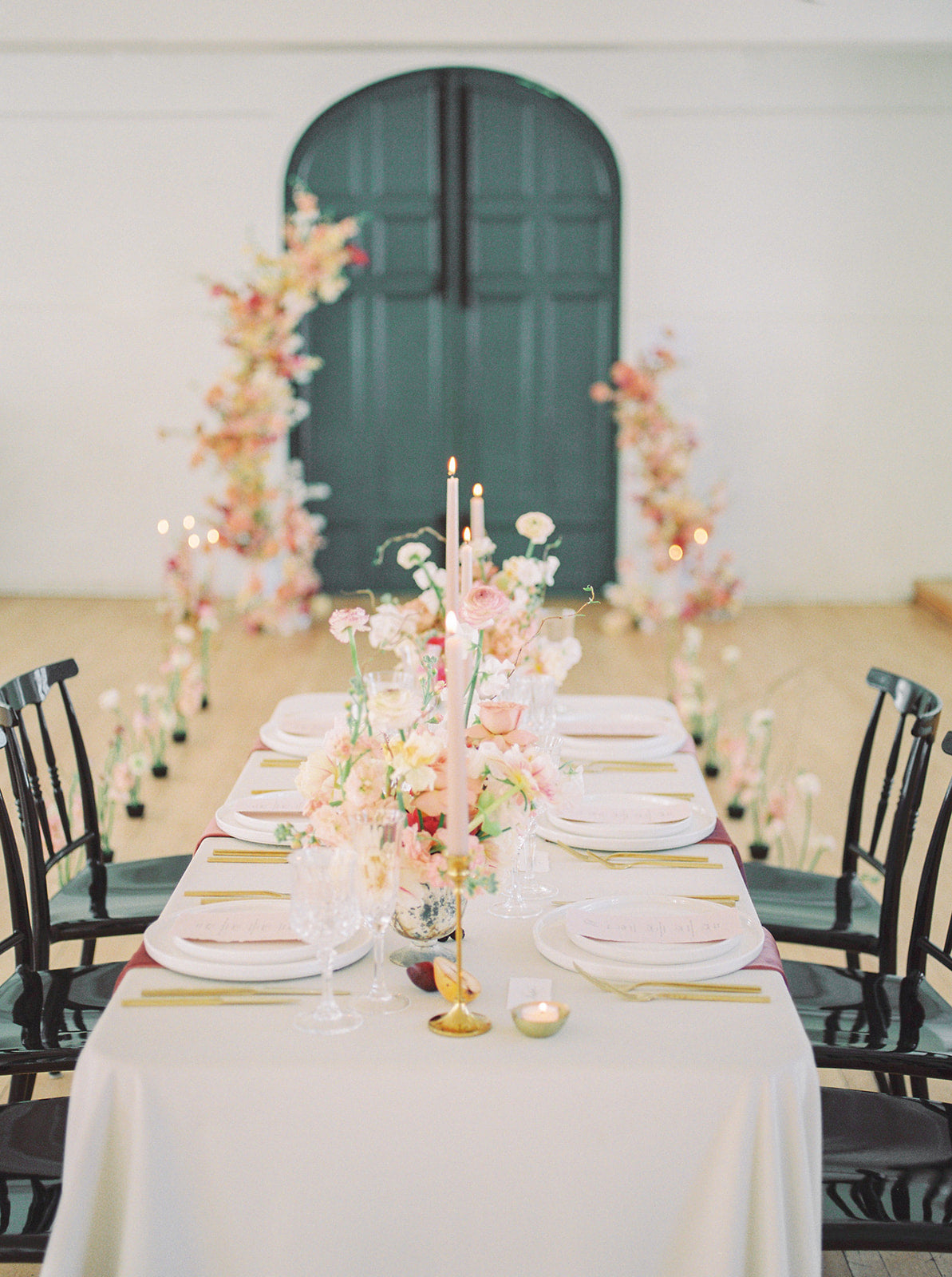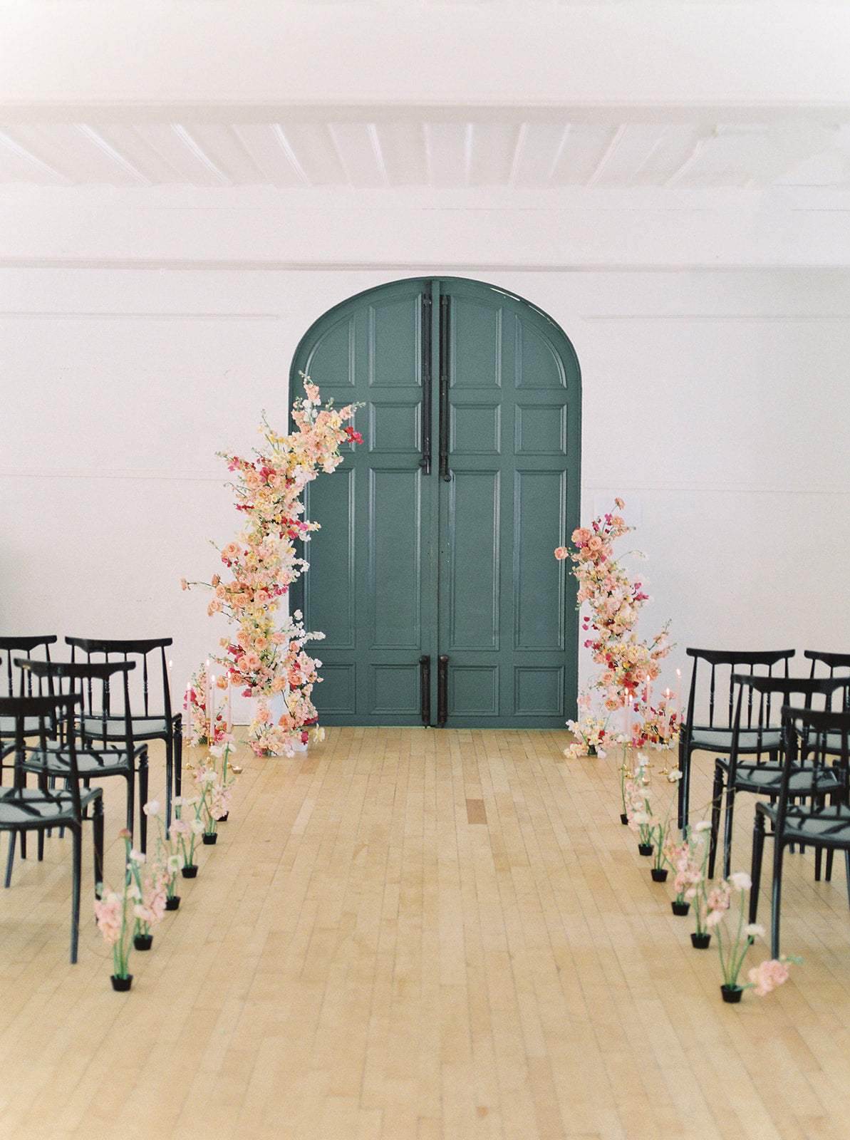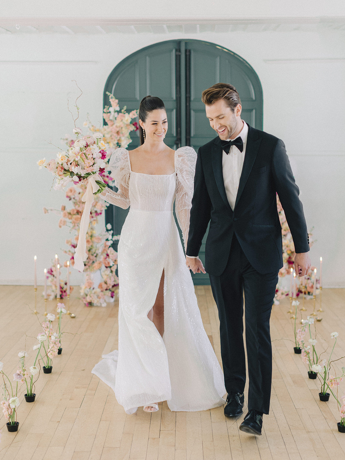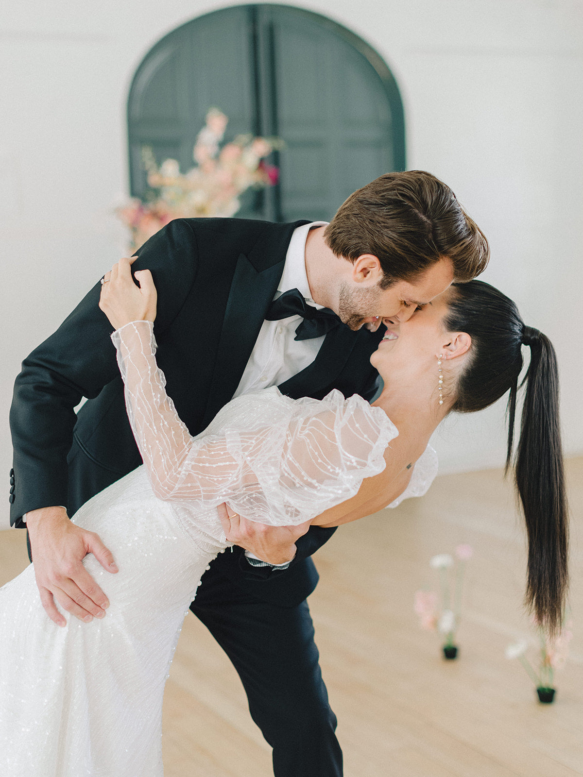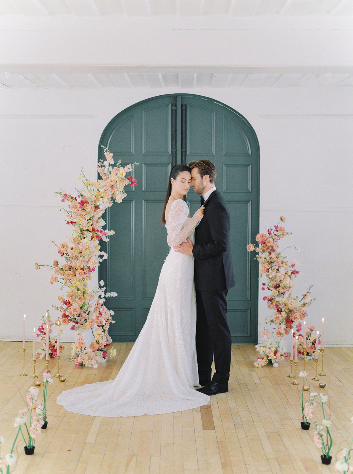 The blush, peach, and magenta florals, carefully arranged against the deep green doors and minimalistic interior, create a sophisticated yet organic ambiance. The bride stuns in an ethereal gown adorned with delicate beading and sheer, puffed sleeves, perfectly complementing the groom’s classic black tuxedo. Together, they embody a refined, yet relaxed elegance—perfect inspiration for couples seeking a chic, timeless wedding look.