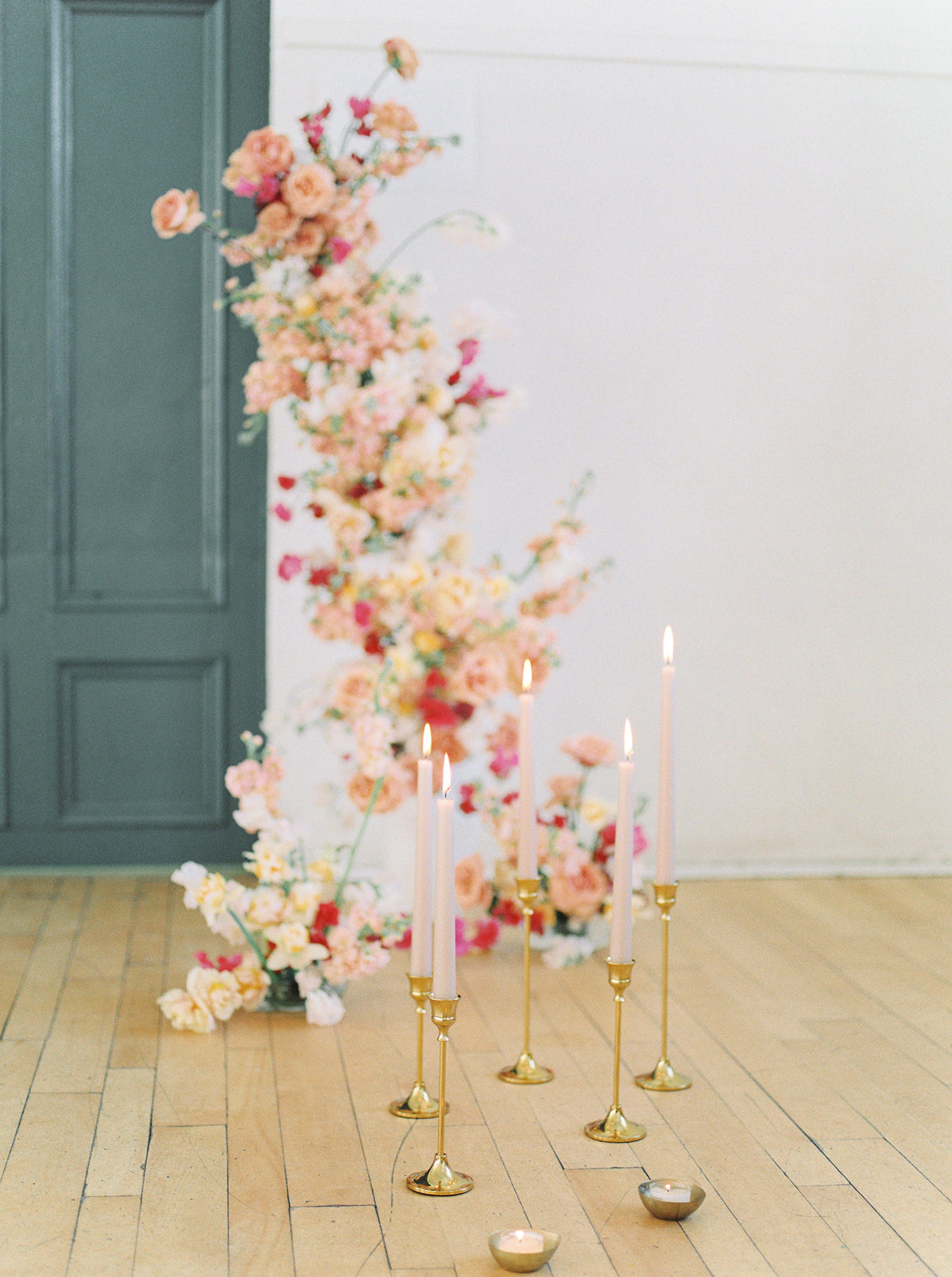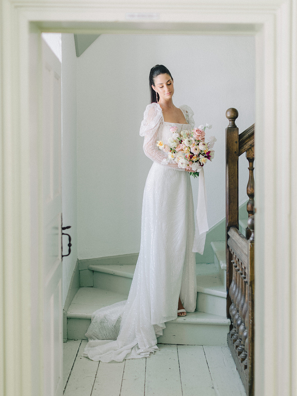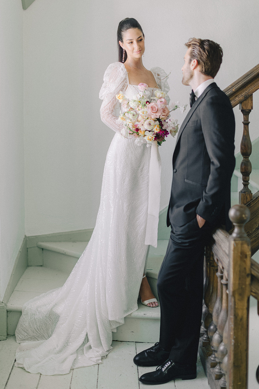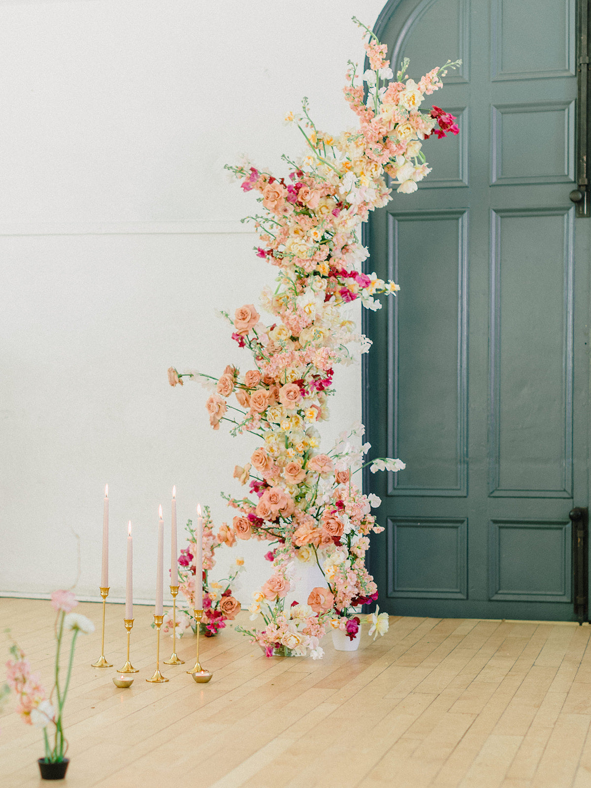 The blush, peach, and magenta florals, carefully arranged against the deep green doors and minimalistic interior, create a sophisticated yet organic ambiance. The bride stuns in an ethereal gown adorned with delicate beading and sheer, puffed sleeves, perfectly complementing the groom’s classic black tuxedo. Together, they embody a refined, yet relaxed elegance—perfect inspiration for couples seeking a chic, timeless wedding look.