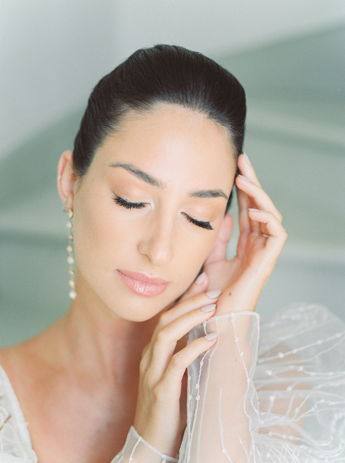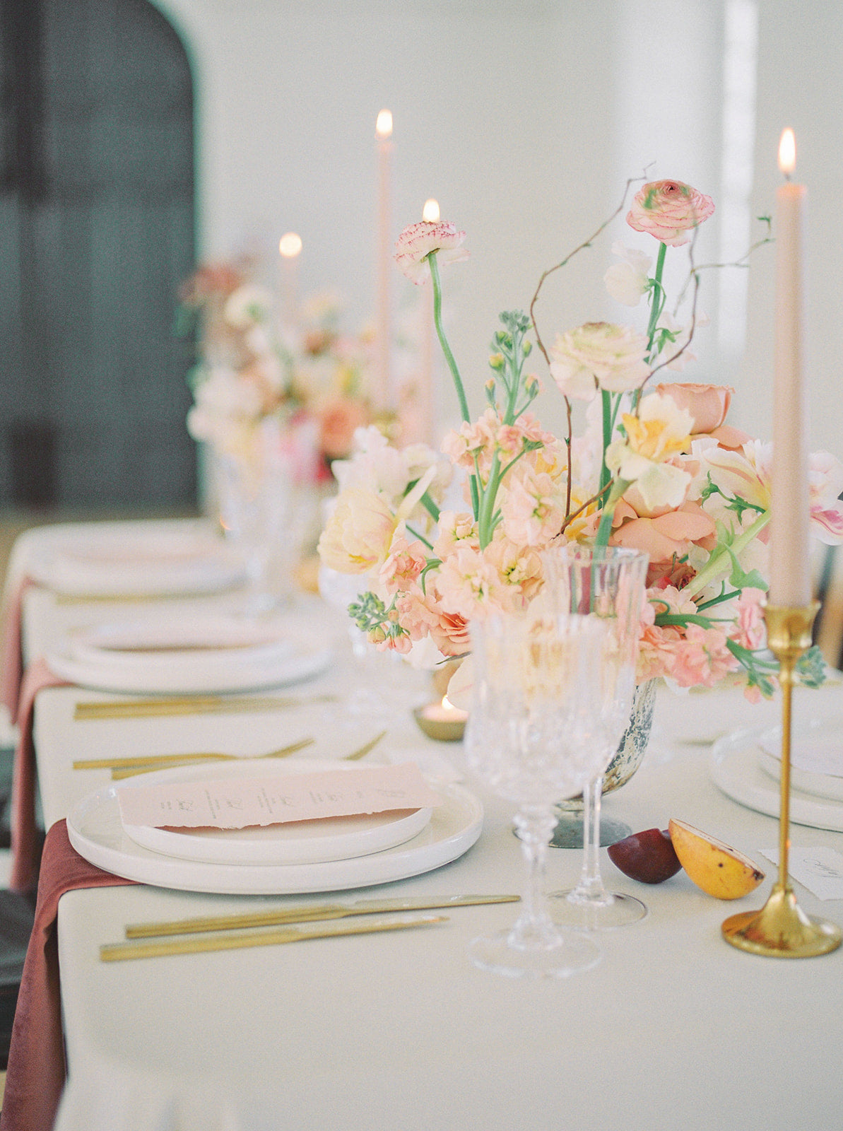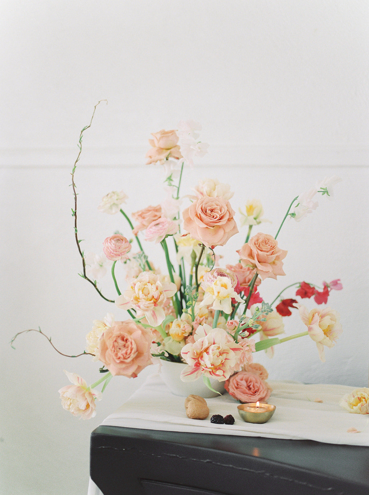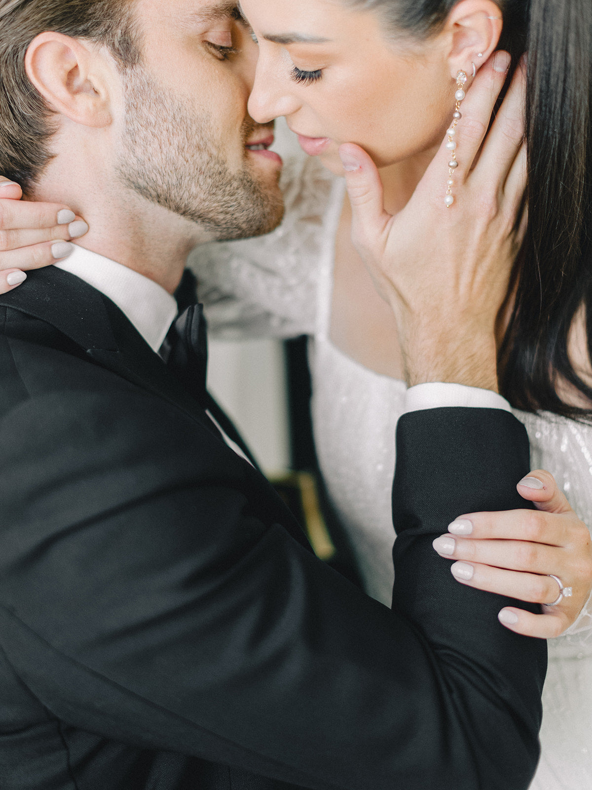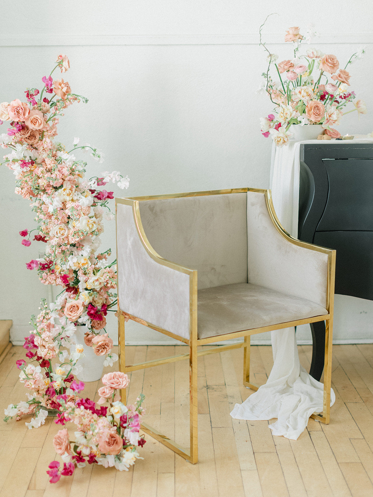 The blush, peach, and magenta florals, carefully arranged against the deep green doors and minimalistic interior, create a sophisticated yet organic ambiance. The bride stuns in an ethereal gown adorned with delicate beading and sheer, puffed sleeves, perfectly complementing the groom’s classic black tuxedo. Together, they embody a refined, yet relaxed elegance—perfect inspiration for couples seeking a chic, timeless wedding look.